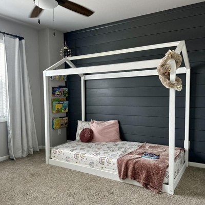 Plenty of room for sleep and play? Now that’s a win-win! The Max & Lily Twin House Bed is the perfect combination of functional and fun that both kids and parents love. Solid, knot-free New Zealand pine wood adds strength and stability. Super fun house frame creates a cool “camping” experience in your room. Added bonus - bed legs can be removed to allow the bed to rest on the floor. All Max & Lily products use a durable, low VOC finish. Instructions, slat roll, and required hardware are included. Flush, color-matched hardware gives this bed a clean, modern look. With solid plywood slats and a metal support bar, this sleeping surface can support 400 pounds of resting weight. Add a trundle or storage drawers (purchase separately) to add even more fun to your room. Designed to accommodate standard twin-size mattresses. This bed meets or exceeds Federal safety standards for kids furniture. 2+ adults make assembly simple and easy. The Twin House Bed from Max & Lily offers exceptional quality and affordability that kids and their parents will enjoy for years to come. Max & Lily is a member of the Maxwood family of brands - the kids furniture experts bringing a tradition of superior quality, safety and fun!