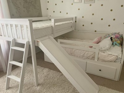 The slide had a small dent in it when received, not bad. The slide is a bit fast also, even for my four year old. Other than that it’s a very pretty looking bed and fits nicely over our day bed without it being to tall for my two toddlers. I love how the slide and the ladder can easily be moved or taken off when the kids get too wild on it.