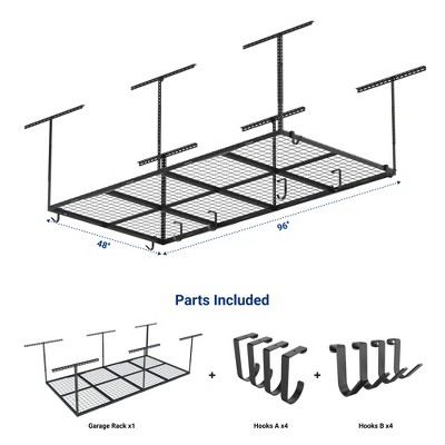 This configuration requires you to supply your own 4 ft. x 4 ft. plywood platform, as it does not include the standard wire grid typically found in overhead racks. The solid plywood surface offers a smoother, more reliable experience—ideal for storing irregularly shaped items. For example, equipment with small wheels, like a wet vac, can roll effortlessly across the plywood, unlike wire grids where casters can get caught.