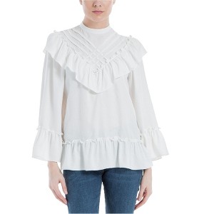 Step into elegance with the Max Studio London Women's Lattice Ruffled Blouse. This blouse, presented by Max Studio London, is more than just clothing – it's a reflection of sophistication and style. The lattice pattern on the chest adds a touch of uniqueness, while the ruffled accents on the chest, cuffs, shoulders, and hem create a sense of femininity. The mock turtleneck with button closure adds an element of sophistication.