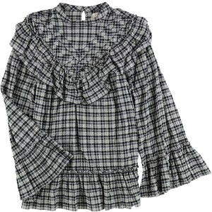 Embrace sophistication with the Max Studio London Women's Ruffled Knit Blouse. This knit blouse, presented by Max Studio London, is a reflection of modern style and elegance. The bell sleeves and classic plaid pattern throughout create a dynamic and eye-catching look, while the ruffled trim and pleated yoke add a touch of femininity. Crafted from a blend of 98% Cotton, 1% Nylon, and 1% Spandex, this blouse offers a medium weight that drapes elegantly.