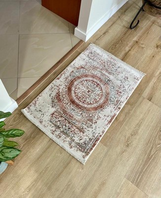 [This review was collected as part of a promotion.] Beautiful rug, we really like the look and style which perfectly matched our decor. Very well made, close attention to detail, and if properly cared for should last quite a while. It is a bit slippery specifically on shiny tile and even on wood floors. Other than that we are very happy with it.