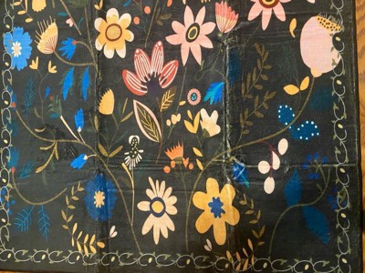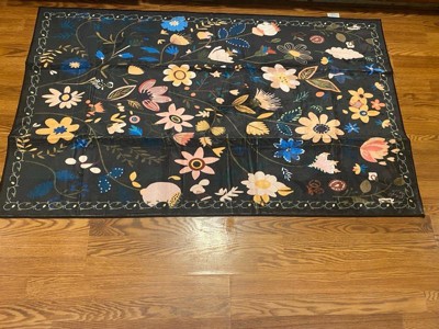 [This review was collected as part of a promotion.] Super cute rug. Vibrant fun colors on beautiful black background. Really nice size. Lays well on my tile floors. Soft under foot. Could not be any easier to clean.