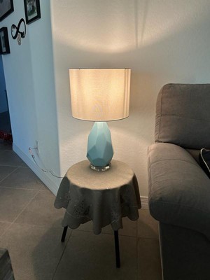 Add a modern, glossy touch to your space with this blue geometric ceramic table lamp – a mix of style and practical function. The faceted ceramic base (shiny blue, eye-catching design) pairs with a soft linen shade, which diffuses light evenly for a comfortable ambiance.