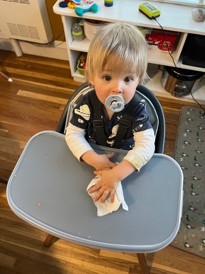 [This review was collected as part of a promotion.] Maxi-Cosi gave our 20-month-old, M, the opportunity to try out their Moa 8-in-1 High Chair, and he put it through rigorous testing as only a toddler can. The directions were straightforward, it was easy to put together with no tools required, and ready to go in less than 10 minutes. The multi-tonal grey with light wood accents looks great in our modern kitchen. We initially tried it out as a traditional highchair and found the sizing well-suited for a toddler, although with the cushioning and high sides I suspect it would be fine for a younger child as well. M didn't mind the straps and they held him securely. We've been using the Cybex Lemo Chair, and one of the drawbacks is that section cup plates and bowls don't stick to the tray well, but they stuck to this tray perfectly (much to M and his dog's dismay). It was also nice to have a tray that could be easily removed with one hand to get him in strapped, unstrapped and back and out, and to pull him up to the table. The tray, seat and straps saw their fair share of fruits, veggies, hummus, etc. over our week of testing and stood up to it all. The straps could use a run through the wash, but the seat and tray come clean easily with just a wipe down. M eats most meals in his high chair in the kitchen, but when we have company we move into the dining room. Typically we'll drag his whole chair in there, but the Moa provided us the option of popping off the seat so we could use it as a booster on one of our dining chairs and have him right at the table with everyone else. The seat was simple to detach and secure to an adult chair, and it was helpful to have the option of booster legs vs. no legs to ensure we got him situated just right. M is still a bit young to try the Moa out as a stool or a desk and chair set, but we love that those options are available. We try to purchase items for our household with as much longevity as possible, and this 8-in-1 definitely fits the bill!