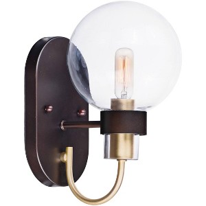The Bauhaus wall light collection by Maxim offers an industrial-inspired Mid-Century look. Featuring a bronze finish with satin brass accents, this single-light wall sconce has a curved arm that supports a clear heavy glass blown shade. It's a dimmable design that looks incredibly stylish in a bedroom or bathroom.