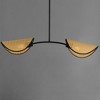Natural cane woven wicker shades curve over exposed light bulbs like the brim of a bonnet on a minimalistic mobile chandelier. The composition of shade and chandelier shape are of a corresponding curvature. The contrast of natural materials and sandy Black silhouette of chandelier form adds nostalgia to an overall modern design. The shades are rotatable under another axis of articulation allowing more flexibility in the design according to your preference.