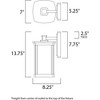 The Material: Aluminum, Finish Color: Bronze, Width: 7", Height: 13.75", Length: 8.25", Depth: 8.25", Height From Outlet Box: 2.5", Backplate Width: 5.25", Backplate Length: 7.75", Lamping Type: Incandescent, Number Of Bulbs: 1, Wattage: 60 Watts, Dimmable: Yes, Moisture Rating: Wet Rated