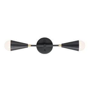 A classic mid-century look, the Lovell collection features two sizes of sputnik chandeliers and streamlined sconces perfect for bath vanity applications. Available in a Black/Satin Brass finish combination. Light bulbs nest inside the metal cones to become an element of the design. Mounting Direction: Omni Back Plate Height: 0.75 Back Plate Width: 4.75 Dimmable: Yes