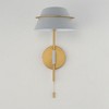 Metal shades of Light French Gray are suspended from halos of Natural Aged Brass. Maximizing the light output, the interior of the shades are painted white and their tops are left open casting light both upwards and below. The collection is completed by a delightful pull-chain operated wall sconce that provides a practical light source ideal for a reading nook or bedside.