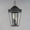 Stately lanterns with perforated filigree along the hood casts a beautiful lighting effect. Finished in Matte Black, the collection is available in multiple sizes as well as flush mount, deck lantern, and two sizes of pendants. Material: Steel, Finish Color: Black, Width: 17", Height: 34", Length: 19.5", Chain Length: 144", Lamping Type: Incandescent, Number Of Bulbs: 6, Wattage: 40 Watts, Dimmable: Yes, Moisture Rating: Damp Rated