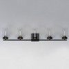 Simple clear glass cylinders are secured by decorative thumb screws in this transitional collection of sconces and pendants both neutral in design and suitable for damp applications. Choose from Satin Nickel or a two-tone Black and Satin Brass finish to pair with popular interior finishes in hardware, plumbing and decor. Material: Glass, Finish Color: Black/Satin Brass, Width: 39", Height: 8.25", Depth: 5.5", Height From Outlet Box: 2.25", Backplate Width: 4.75", Backplate Length: 4.75", Lamping Type: Incandescent, Number Of Bulbs: 5, Wattage: 60 Watts, Moisture Rating: Damp Rated