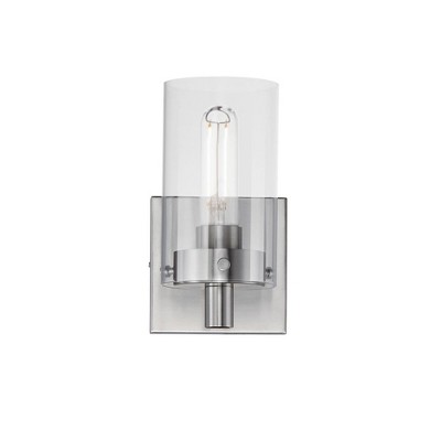 Simple clear glass cylinders are secured by decorative thumb screws in this transitional collection of sconces and pendants both neutral in design and suitable for damp applications. Choose from Satin Nickel or a two-tone Black and Satin Brass finish to pair with popular interior finishes in hardware, plumbing and decor. Material: Glass, Finish Color: Satin Nickel, Width: 39", Height: 8.25", Depth: 5.5", Height From Outlet Box: 2.25", Backplate Width: 4.75", Backplate Length: 4.75", Lamping Type: Incandescent, Number Of Bulbs: 5, Wattage: 60 Watts, Moisture Rating: Damp Rated