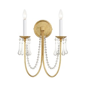 Sweeping metal accents links create classic curves on a minimalist chandelier. Available in hand-rubbed Chestnut Bronze or elegant Gold Leaf finishes. Add crystal accents to elevate the design for a more extravagant glamour. The design manages to evoke French Country charm and enchants any room it illuminates. Material: Iron, Finish Color: Gold Leaf, Width: 14", Height: 16", Depth: 5.25", Height From Outlet Box: 5.5", Backplate Width: 5", Backplate Length: 5", Lamping Type: Incandescent, Number Of Bulbs: 2, Wattage: 60 Watts, Dimmable: Yes, Moisture Rating: Dry Rated