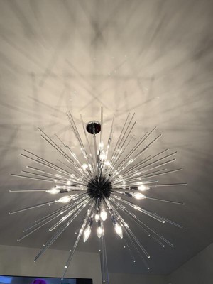 Our living area is very modern with high ceilings, spectacular lighting, great paint, and beautiful floors. So when considering lighting I wanted something to compliment our open concept while providing style. I saw this jazzy chandelier and knew it would create not just great lighting but create a work of art! Mission accomplished!