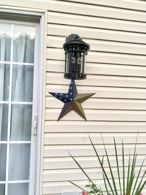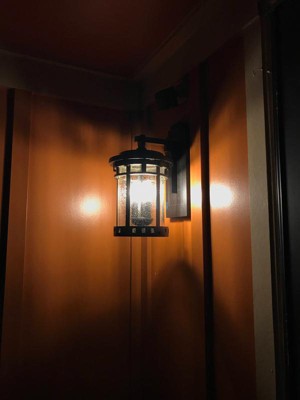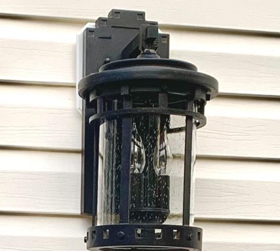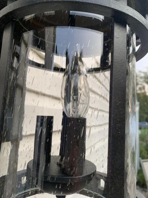 [This review was collected as part of a promotion.] This is a well-constructed outdoor light fixture. The detailed craftsmanship is impressive as well as its heft. I replaced an existing fixture by our back entry patio door and its large in comparison. The instructions were well written and straightforward which made it easy to install. It requires three candlelight bulbs, less than 40 watts each, which were not included. The seedy shade added character to this fixture which is what my wife and I were looking for when we chose this light. We were looking for a rustic appearance and expected a weathered bronze finish yet its black. Aside from this disappointment, it is a handsome light with a wow factor and provides sufficient light to our patio. I am glad we finally replaced our old fixture as we have received various compliments and gives our patio a new look.