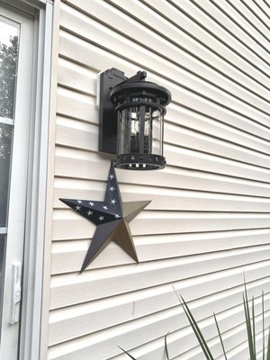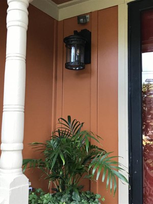 [This review was collected as part of a promotion.] We just did a big siding remodel to our house, changing from bandaid colored wood siding to hardiplank painted a copper orange. Because of all our costs in the reno, my husband opted to change our porch light to something on the cheap end. It was okay, but very plastic-y. I found this fixture and was able to swap them out myself — what a difference it made to the feel of the porch! We are both very happy with it. It’s solid, stylish, and quite beautiful both on and off. It’s much larger than I realized too, but that’s a good thing.