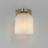 Undulating metalwork curves around modern bell-shaped glass shades fitted within the frame of these bath vanity sconces. Available in either Clear or Marble glass and complimentary finishes of Polished Chrome, Matte Black, or Natural Aged Brass. This collection is a delightful addition to your next project. Material: Steel, Finish Color: Natural Aged Brass, Width: 5.5", Height: 7.25", Depth: 6.25", Height From Outlet Box: 2.5", Backplate Width: 4.75", Backplate Length: 4.75", Lamping Type: Incandescent, Number Of Bulbs: 1, Wattage: 60 Watts, Dimmable: Yes, Moisture Rating: Damp Rated