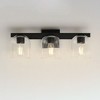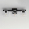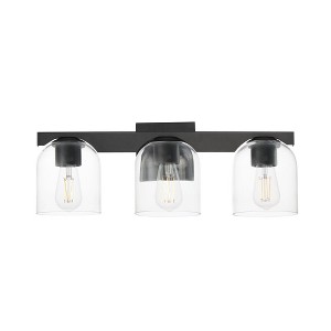 Undulating metalwork curves around modern bell-shaped glass shades fitted within the frame of these bath vanity sconces. Available in either Clear or Marble glass and complimentary finishes of Polished Chrome, Matte Black, or Natural Aged Brass. This collection is a delightful addition to your next project. Material: Glass, Finish Color: Black, Width: 21.5", Height: 8", Depth: 7", Height From Outlet Box: 2.5", Backplate Width: 5", Backplate Length: 5", Lamping Type: Incandescent, Number Of Bulbs: 3, Wattage: 60 Watts, Dimmable: Yes, Moisture Rating: Damp Rated