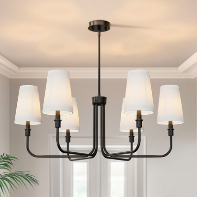 Graceful arcs of rectangular tubing transition to round cups that support tapered Satin White glass shades creating a crisp and clean transitional design. The frame is finished in your choice of Satin Nickel or Black which bridges modern and transitional design aesthetics. Canopy Included: Yes Canopy Diameter: 5.00 Sloped Ceiling Adaptable: Yes Chain Length: 36.00 Dimmable: Yes Shade Included: Yes Shade Dimensions: 5.75