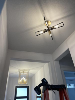 Sharp lines radiate from a pointed pin central body creating geometric angled wings that are sandwiched between matching conical fonts. Finished in a combination Antique Brass and Black, this collection is both contemporary and warm. Complete this look with vintage T10 light bulbs to for the full effect. Dimmable: Yes Material: Steel, Finish Color: Black/Satin Brass, Width: 25", Height: 14.75", Length: 25", Hanging Method: Flush, Lamping Type: Incandescent, Number Of Bulbs: 4, Wattage: 60 Watts, Dimmable: Yes, Moisture Rating: Dry Rated