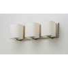 Satin White bands of cased glass wrap around each lamp creating a soft ribbon of light. Back plates finished in Polished Chrome or Satin Nickel complement the majority of bath fittings. Back Plate Height: 5.50 Dimmable: Yes Shade Included: Yes Shade Dimensions: 5.25 Material: Glass, Finish Color: Satin Nickel, Width: 19.25", Height: 5.75", Length: 5.5", Depth: 5.5", Height From Outlet Box: 2.75", Backplate Width: 19.25", Backplate Length: 5.5", Lamping Type: Incandescent, Number Of Bulbs: 3, Wattage: 60 Watts, Dimmable: Yes, Moisture Rating: Damp Rated