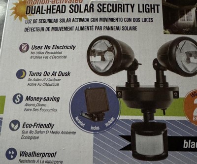 - The Maxsa Innovations Solar-Powered Dual Head LED Security Spotlight has two adjustable heads to aim light and automatically turns on when motion is detected after dusk.