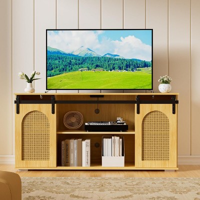 Product Name: MAXYOYO Farmhouse TV Stand for Televisions up to 65 Inches, Rattan Barn Doors with Storage Cabinets, Walnut