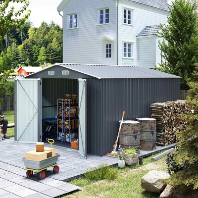 MAYEERTY 10x14 FT Outdoor Metal Storage Shed, 3 Lockable Doors 4 Vents Sloped Roof Galvanized Steel Tool Shed, Dark Grey
