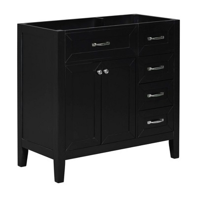 This 36-inch black bathroom vanity base (without sink) features a solid frame and MDF board construction, paired with one enclosed cabinet and three drawers for balanced storage. Designed to complement any sink style, it provides dedicated space for toiletries, towels, and other bathroom essentials¡ªwith drawers for easy access and a cabinet for hidden storage. The solid frame ensures stable support, and the MDF board with a black painted finish resists moisture and is easy to clean. Ideal for modern bathrooms, it combines functionality with a bold, sleek aesthetic.