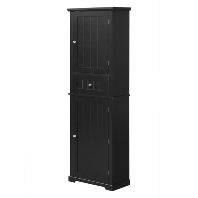 A tall and wide black storage cabinet with doors and three drawers caters to both bathrooms and offices, delivering ample multi-dimensional storage. The three drawers keep small essentials accessible, and the enclosed doors conceal bulky clutter or private items. Crafted from sturdy, moisture-resistant materials, it¡¯s reliable in humid bathrooms and supports office supplies for long-term use. The bold black finish adds sleek modern flair, elevating contemporary decor in dual environments.
