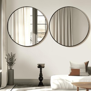 The MAYEERTY 35x35x1in hanging mirror is a round design with a black aluminum alloy thin edge. The round shape softens the lines of a room, the black finish suits modern decor, and the slim edge keeps it lightweight. Wall-mounted, it acts as a space-saving, decorative mirror in bathrooms or bedrooms.