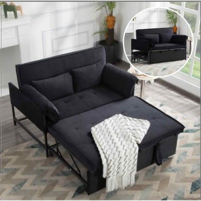 MAYEERTY 34.3” convertible pull-out sleeper chair can be easily turned into a twin size bed by pulling the straps on the edge, perfect for overnight guests. It is built with a sturdy metal and manufactured wood frame for lasting durability, upholstered in soft velvet fabric for comfortable seating, and comes with 1 matching toss pillow. The backrest has 3 adjustable angles (110°~145°~180°) for sitting, reading, watching TV or lounging, and converts to a bed in seconds, making it ideal for homes, offices, guest rooms and small spaces. A movable arm cushion is included for extra comfort. The cushions use vacuum packaging; pat them after unpacking and allow at least 72 hours for full rebound. All assembly tools are packed in one box, and an installation video is available via QR code.