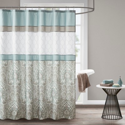 72"x72" Transitional shower curtain in colorblock, geometric and damask prints.
