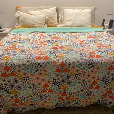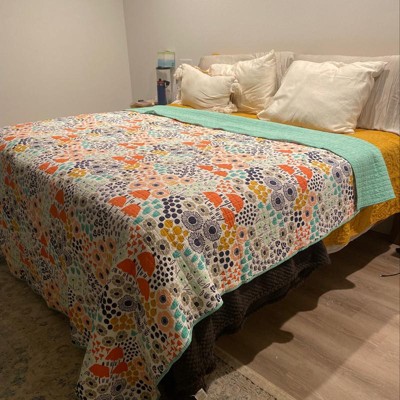 The pattern is lovely, the colors vibrant. It did shrink a little (as expected given that it is 100% cotton) so if you want a lot of overhang you might size up to a king for a queen bed. Very happy with this new pop of color in the room!