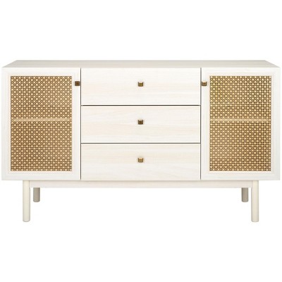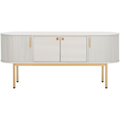Ships in two seperate boxes. Uplift your home with the playful charm and elegance of our Mayln sideboard. Our clean-lined storage unit charms with its sleek and eye-catching artistry. Rhythmic curves are engraved onto the facade to add interest and drama to any corner. The frame showcases the rich grains of wood in a bleached white finish to create a stunning contrast with its white facade. Elevated upon gold metal legs, our sideboard serves as a chic and charming focal point for any room. Four spacious cabinets allow our sideboard to serve as a perfect media stand, office cabinet, or buffet.