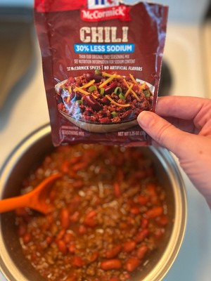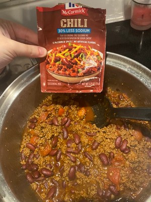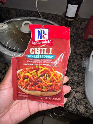 What's McCormick 30% Less Sodium Chili Seasoning Mix all about? Great tasting chili with less sodium! With 30% less sodium and no added MSG or artificial flavors, you can feel good about serving your family the best. It's blended with McCormick spices, including chili pepper, onion and garlic. Mix with your favorite beef or turkey chili recipe for a quick weeknight meal that will have the whole table craving seconds.