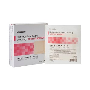 These McKesson foam dressings help protect wounds and create an environment that is conducive to healing. The hydrocellular foam dressings seal the margins of the wound, limiting fluids from reaching the surrounding tissue. A breathable outer film layer provides air flow to maintain a healthy wound environment. Resistant to moisture and dirt, the bandages protect wounds and keep them safe. The acrylic adhesive on the wound foam dressings keeps them firmly attached to the skin. They can be lifted, re-positioned and re-attached to allow users to monitor the healing of a wound. Each wound adhesive dressing measures 6 x 6 inches to provide complete wound coverage. Intended for single-use applications, they're disposable.