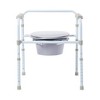 Introducing the McKesson Folding Commode Chair with 7.5 qt Bucket - 350 lbs Capacity, a versatile and durable aid for those in need of assistance with bathroom mobility. This 3-in-1 design can function as a bedside commode, raised toilet seat, or toilet safety frame. The powder-coated, steel-welded construction provides a sturdy frame that can support up to 350 lbs. The lightweight and easy-to-fold design makes it perfect for travel or storage. With a push-button height adjustment system, removable steel back bar, and snap-on plastic seat and lid, this commode chair can accommodate different users and preferences. The plastic armrests provide added comfort and support. The 7.5-quart commode bucket comes with a carry handle, cover, and splash shield for easy, clean disposal. Non-skid tips provide added security and safety. Easily adjust the height of this portable toilet from 16 3/5 inches to 22 1/2 inches with a push of a button. The plastic seat is 15 inches deep and 13 1/2 inches wide to support most users. Best of all, this commode chair can be assembled without any tools needed.
