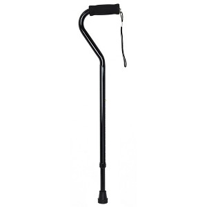 The McKesson Offset-Handle Aluminum Cane is a reliable and convenient aid for those in need of additional support while walking. Designed for enhanced maneuverability, this standard-style cane allows use in narrow spaces such as staircases. The offset handle is ergonomically designed to aid walking by better-distributing weight over the cane, providing increased stability, comfort, and convenience. Manufactured with sturdy 7/8-inch extruded aluminum tubing, this cane adjusts to a safe height and can support users up to 300 lbs. The easy-to-use, single-push button adjusts height from 30 to 39 inches, and the locking ring tightens to prevent rattling, adding security and reducing irritating noise. The cane features durable, 3/4-inch, molded rubber tips with metal washer inserts to prevent the cane from piercing the rubber tip, allowing lasting use. The sleek design features a black finish, grip, and tips, and the attached wrist strap provides convenient use, accessibility, and storage. Lightweight aluminum construction makes this cane ideal for users with limited upper body strength. Stay safe and secure while walking with the McKesson Offset-Handle Aluminum Cane.
