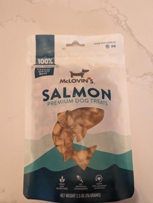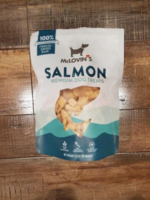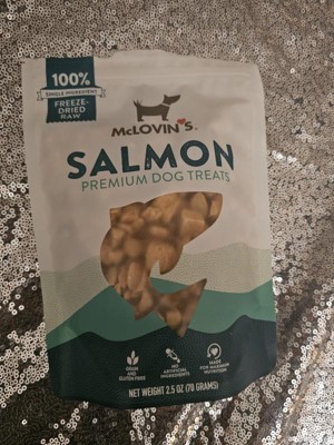 McLovin's All Ages Freeze Dried Dog Treat with Salmon Flavor - 2.5oz Is a really tasty product for my dog. I have a Puggle and she gets so excited whenever I open the bag to give her some treats. They are small and lightweight so I give her a little bit at a time. Just enough for her to want to eat it and want more. She is a happy dog with these treats.