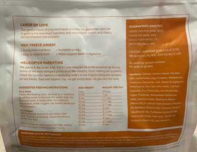 Good as a topper or occasional treat. This product is freeze dried chicken. The food is shaped in pellets/ bite sized morsels. My dog is very finicky but she seems to enjoy this as a topper and will eat it from my hand when I give it to her. It gives an extra flavor to her dry food to keep things interesting.
