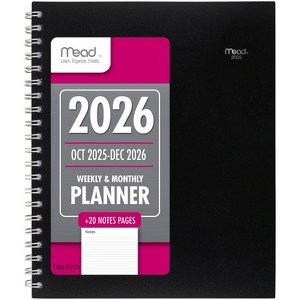 Stay on top of every deadline, event and meeting with the Mead Basic Weekly Monthly Planner. This planner covers 15 months from October 2025 — December 2026 for a full year of planning and beyond. Weekly spreads have lined space for each day, which makes it easy to track your schedule. Current and future month reference calendars are shown on each page. Each month has unruled daily blocks, a column to jot down notes and two reference calendar blocks. Pages measure 8 1/2" x 11", with monthly spreads. Expand your organizational skills with special pages, including a 3-year reference calendar, future planning, a double-sided paper pocket and 20 total notes pages. Planner has a black cover and silver twin wire binding to help keep pages secure.