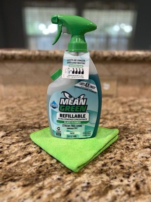 [This review was collected as part of a promotion.] This Mean Green refillable glass cleaner is amazing! It gives a streak free finish and smells great! I love that the bottle is refillable by just adding water to the side spout, no need to interact with the concentrated chemical on the other side and no measuring! This product is great!