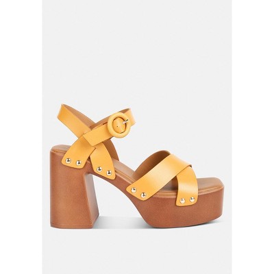 These genuine suede leather clogs feature criss-cross upper straps adorned with metallic stud embellishments for a chic vibe. The chunky wooden texture platform block heel adds dimension while the cushioned insole ensures optimum comfort. They exude a slip-on style which makes them an effortless summer-ready choice. Type: Clogs Upper Material: Genuine Suede Leather Outer Sole: TP Rubber Open Square Toe High Platform Block Heel Textured Heel Detail Metallic Stud Embellishments Criss Cross Straps Vamp Slip On Design Comfortable Cushion Insole Heel Height: 3.5 inches RCSH5434