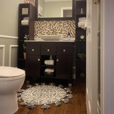 I love this rug. The shape is exactly what i wanted. You don’t find too many round bag rugs these days. It has a beautiful design and the tassels add a very nice boho type flare to it. It is much bigger than I expected though. I wanted to use it for my much smaller vanity in the bathroom but it’s too big for that space. I think this works perfectly for right outside of the tub rather.