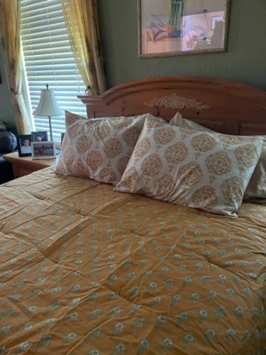Bring artistic flair to your bed space with this Medallion-Print Comforter & Sham Set from Threshold™. This decorative comforter set includes one comforter and sham(s), each made from a soft cotton-polyester blend shell with polyester fill to offer you cozy comfort as you drift off to dreamland. Showcasing a medallion print in gold on a white background on the front and a golden reverse adorned with an allover floral print, this printed comforter set lends a touch of style to your bedroom decor. Coordinate these pieces with the sheets of your choice and toss comfy shams and pillows for a striking look.