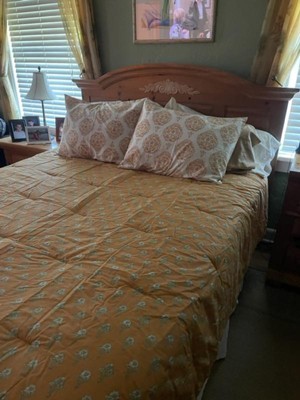 I just love this Medallion reversible comforter & sham set by threshold. The color is so vibrant. It is true to size. It is so soft and it keeps me warm. It’s not heavy. The material is not hard and itchy like other comforters. I receive a lot of compliments. It makes my room bright. With the gold accent color. I highly recommend this comforter set.