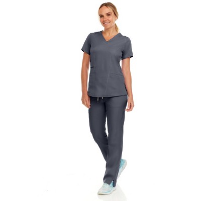 • This V-neck top and essential cargo pants set blends style, comfort, and functionality. The top includes a stylish chest pocket and a slit hem. The pants feature a straight leg tapered design, 7 functional pockets, a yoga waistband, and a soft stretch drawstring to keep you looking your best while at work.