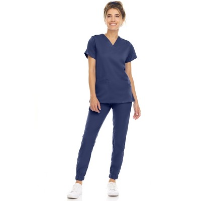 MediChic Scrubs for Women's V-Neck Scrub Set with Six Pocket Cargo Jogger Pants with 4-Way Stretch, Navy XX Small